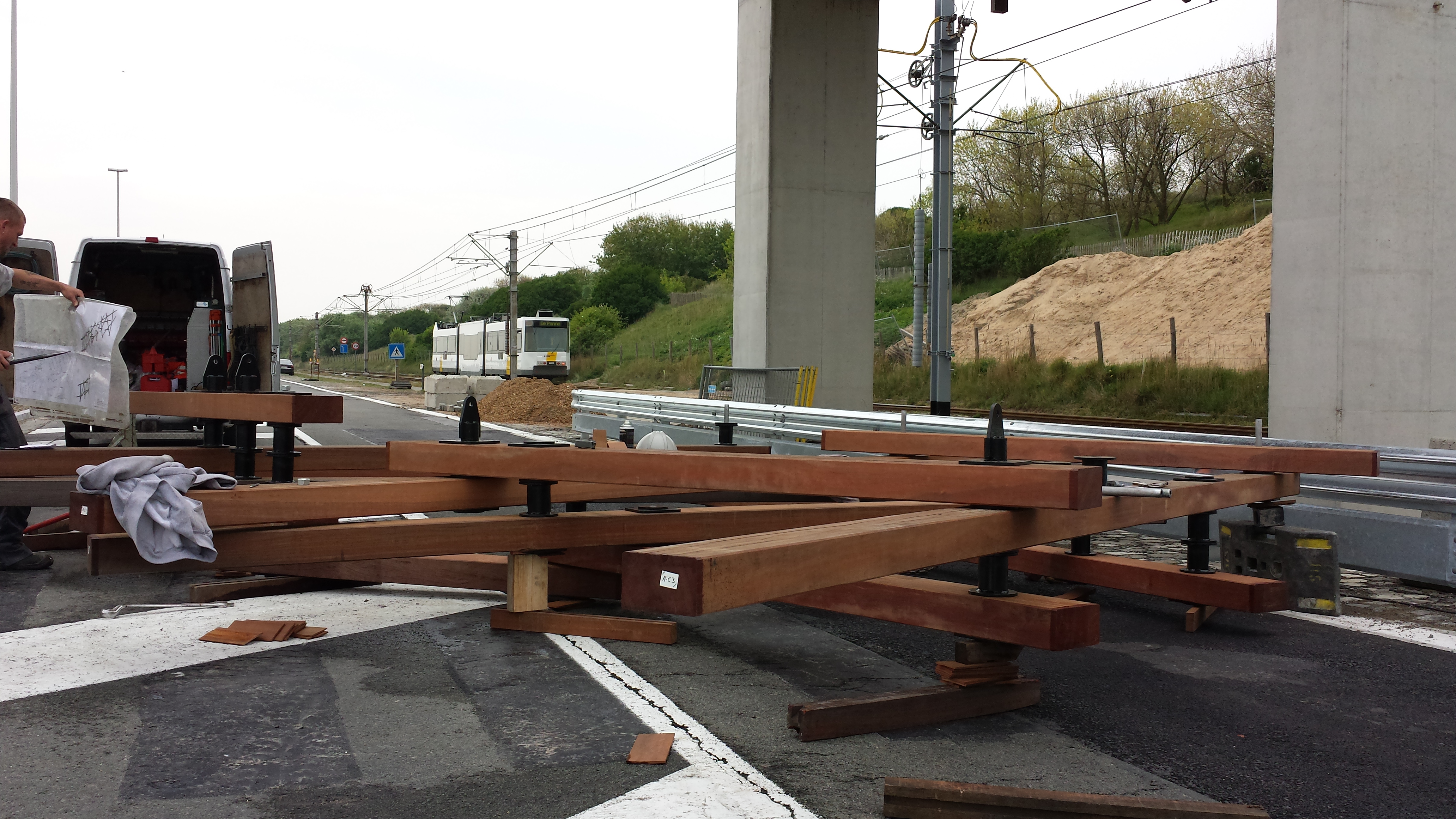 Plaatsen van het vakwerk wat van de brug de duin op gaat